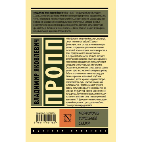 "Морфология волшебной сказки", пожалуй, самая знаменитая работа XX века в фольклористике, хотя ее значение выходит далеко за пределы науки: она повлияла на писателей, композиторов, киносценаристов и даже программистов и маркетологов. В. Я. Пропп отказывается от чисто литературоведческого подхода к изучению народного творчества и обращается к математическим методам и структуральной лингвистике. Оказывается, персонажи самых разных сказок делают одно и то же: змей похищает царевну, баба-яга готовит испытания и награду для Ивана-царевича, волшебный клубочек указывает дрогу. Герой же нарушает запрет, отправляется в путь, находит помощника и сталкивается с врагом, решает трудную задачу, получает награду и возвращается домой, где его ждут пир на весь мир, невеста и полцарства. Пропп описывает законы сказочного повествования: семь типов персонажей выполняют 31 функцию – именно они создают единый стержень и структуру волшебных сказок разных народов мира.