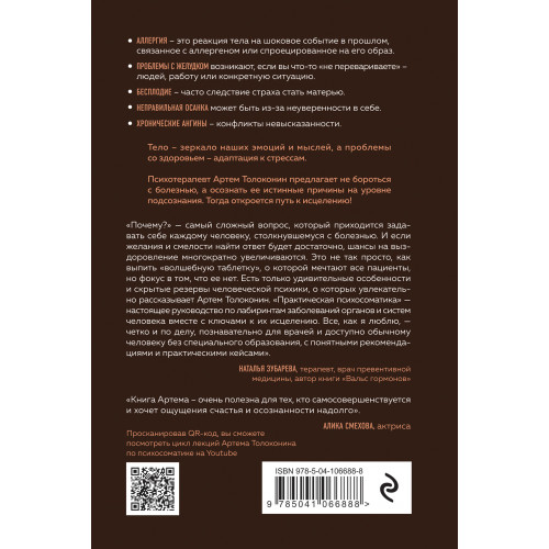 Психотерапевт Артем Толоконин утверждает, что причины болезней кроются в психосоматике — внутренних факторах и психологических аспектах. Недуг можно изучить, докопаться до его корней, тем самым устранив его. И тогда — уверяет врач — выздоровление не за горами. Болезнь — это способ организма приспособиться к травме, тяжелой ситуации, которая была проигнорирована. Важно уметь слушать и слышать свое подсознание, которое точно знает причины самых разных недугов. Благодаря этой книге вы сможете опознать и излечить не только собственное заболевание, но и искоренить деструктивное влияние многих поколений до нас, ведь часто недуг кроется в самом генетическом коде. Артем твердо заявляет, что все — вполне решаемо, если быть в гармонии с самим собой и уметь прислушиваться к внутренним сигналам. «Для чего?» — самый сложный вопрос, который приходится задавать себе каждому человеку, столкнувшемуся с болезнью. И если желания и смелости найти ответ будет достаточно, шансы на выздоровление многократно увеличиваются. Это не так просто, как выпить «волшебную таблетку», о которой мечтают все пациенты, но фокус в том, что ее нет. Есть только удивительные особенности и скрытые резервы человеческой психики, о которых увлекательно рассказывает автор. «Практическая психосоматика» — настоящее руководство по лабиринтам заболеваний органов и систем человека вместе с ключами к их исцелению. Все, как я люблю — четко и по делу, познавательно для врачей и доступно обычному человеку без специального образования, с понятными рекомендациями и практическими кейсами«. Наталья Зубарева, терапевт, врач превентивной медицины, автор книги «Вальс гормонов». «С большим интересом прочла новую книгу Артёма. Считаю ее очень полезной для тех, кто самосовершенствуется и хочет долгосрочного ощущения счастья и осознанности». Алика Смехова, актриса.
