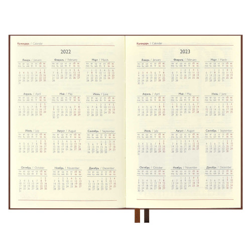 Ежедневник датированный "2022", А6+, арт. 57635/ 15 ЖАТКА КОРИЧНЕВЫЙ (кожзам: 126х174 мм, мягкий переплёт, материал обложки: искусственная кожа "Жатка"; декор: блинтовое тиснение; способ крепления блока: ниткошвейный; вн. блок: 176 л., тонированный офсет 70 г/м2, печать в две краски (линия), справочный материал: есть; перфорация углов блока: нет; отделка среза: окрашивание пантоном; закладка/-и: два ляссе; каптал: есть; форзац: печать пантоном; особенности: в блоке использованы мотивирующие цитаты; персонализация возможна: да; индивидуальная упаковка: ПЭТ-пакет)