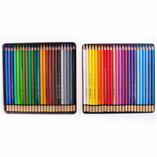 Стержни карандашей изготовлены из прессованной акварели. Это позволяет рисовать ими как простыми карандашами, после чего смоченной в воде кистью размывать нанесенные штрихи. Получаемое изображение похоже на акварельный рисунок. Набор цветных карандашей включает в себя 48 цветов, упакованы в металлический пенал.