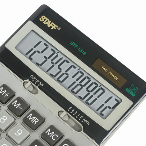 Настольный калькулятор STAFF STF-1312 в прочном металлическом корпусе выполняет все необходимые вычисления на работе и дома. Кнопки нажимаются легко и приятно, позволяя работать с максимальным комфортом.Калькулятор производит все основные арифметические действия, вычисления с памятью, вычисления с процентами, извлечение квадратного корня и возведение в степень. Клавиша MU позволяет выполнять расчеты с включенным процентом (налогом или торговой наценкой). Функция GT выводит на экран общую сумму всех вычислений. Переключатели округления и положения десятичного знака позволяют настроить калькулятор для выполнения различных вычислительных задач. Благодаря двенадцатиразрядному дисплею калькулятор может работать с большими значениями и с высокой точностью округления. Встроенный аккумулятор и солнечная батарея, образующие единую схему питания калькулятора, позволяют устройству работать при любом освещении. Размер - 170х125 мм.