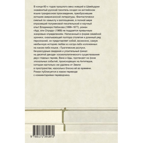 «Ада, или Отрада» — новый перевод романа Владимира Набокова «Ada or Ardor» на русский язык. В нем читатель найдет прозу, уже знакомую ему по другим книгам Набокова, которую отличает изысканная образность, зримость и притягательность. Она преображает реальность, остроумно смешивая друг с другом знакомые нам элементы, и в итоге перед нами предстает детально воссозданный мир‑химера — чудное сочетание смутно узнаваемых предметов и явлений.