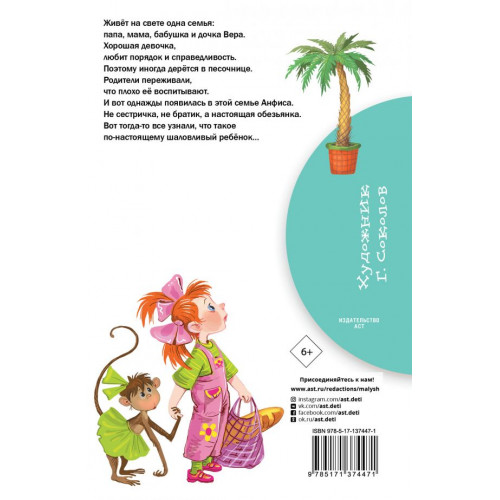 В книгу вошли шесть классических историй про девочку Веру и обезьянку Анфису. Однажды в семье педагогов появляется настоящая, живая обезьянка. Дочке Вере это, конечно, очень нравится – её скучная дошкольная жизнь в детском саду и дома тут же превращается в череду приключений. Но при этом девочка понимает: она теперь старшая и отвечает за поведение своей озорной подружки.Для младшего школьного возраста.