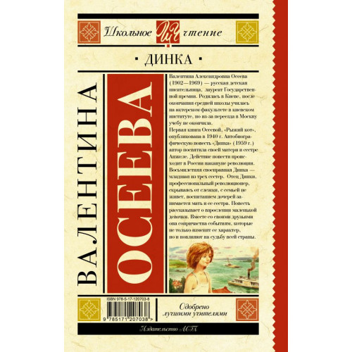 Валентина Александровна Осеева (1902—1969) — русская детская писательница, лауреат государственной премии. Родилась в Киеве, после окончания средней школы училась на актёрском факультете в киевском институте, но из-за переезда в Москву учебу не окончила. Первая книга Осеевой "Рыжий кот" опубликована в 1940 г. Автобиографическую повесть "Динка" (1959 г.) автор посвятила своей матери и сестре Анжеле. Действие повести происходит в России накануне революции. Восьмилетняя своенравная Динка младшая из трех сестер. Отец Динки, профессиональный революционер, скрываясь от слежки, с семьей не живет, воспитанием дочерей занимается мать и ее сестра. Повесть рассказывает о взрослении маленькой девочки. Вместе со своими друзьями она сопричастна событиям, которые не только изменят ее характер, но и повлияют на судьбу всей страны.