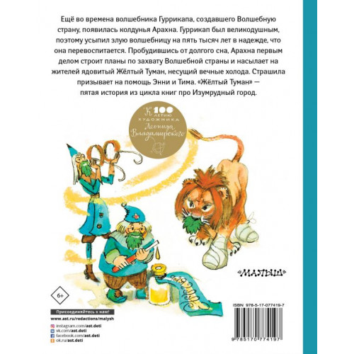 "Жёлтый туман" - пятая сказочная повесть из цикла книг А. Волкова про Изумрудный город. Колдунья Арахна пробуждается от долгого сна и сразу замышляет захватить всю Волшебную страну. Только злые и грозные великаны, такие, как она, имеют право властвовать. Арахна забыла часть колдовских умений, но у неё всё же получается наслать на несчастных жителей отравляющий ледяной жёлтый туман. На помощь спешат Энни, Тим и Чарли Блек. Художнику книги Леониду Владимирскому в 2020 году исполняется 100 лет. Автор книги Александр Волков считал его иллюстрации лучшими.Для среднего школьного возраста.