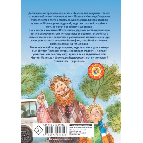 Долгожданное продолжение книги "Шоколадный дедушка". На этот раз самые обычные норвежские дети Мартин и Матильда Сьюрсены отправляются в гости к своему дедушке Оскару. Оскара недаром прозвали Шоколадным дедушкой, ведь он страшный сластёна и жить не может без конфет и шоколада. Как и всегда, в компании Шоколадного дедушки детей ждут невероятные приключения: они путешествуют во времени, знакомятся с самыми настоящими викингами и разыскивают похищенный сундук, в котором хранится волшебный артефакт, способный исполнить любое желание, но только одно. Очень важно найти сундук вовремя, ведь он попал в руки к коварным сёстрам Паульсен, которые ненавидят сладости и мечтают уничтожить их по всему миру. Удастся ли им задуманное, или Мартин, Матильда и Шоколадный дедушка успеют им помешать? Читай книгу - и узнаешь.Для среднего школьного возраста.