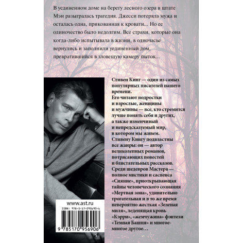 В уединенном доме на берегу лесного озера в штате Мэн разыгралась трагедия. Джесси потеряла мужа и осталась одна, прикованная к кровати. Но ее одиночество было недолгим. Все страхи, которые она когда-либо испытывала в жизни, в одночасье вернулись и заполнили уединенный дом, превратившийся в зловещую камеру пыток.